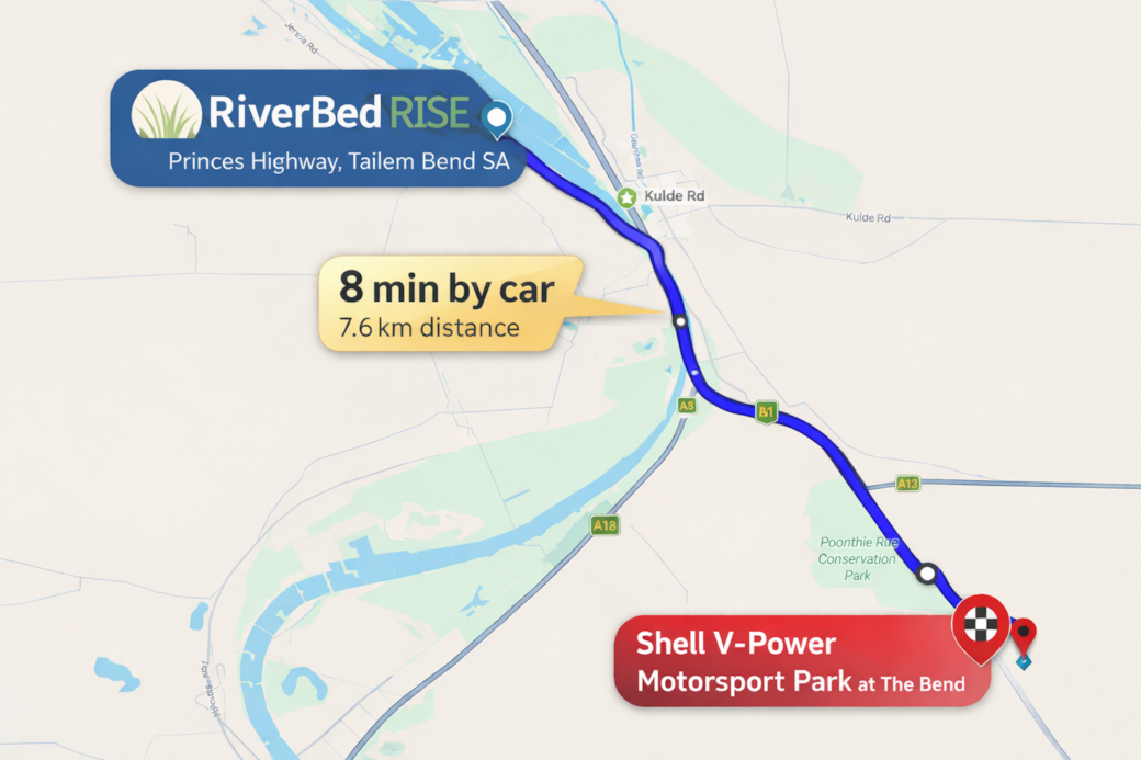 RiverBed Rise is just 8 minutes (7.6 km) from Shell V-Power Motorsport Park at The Bend, making it a convenient base for race weekends, track days and major events. The drive is straightforward via Princes Highway, with easy access in and out of Tailem Bend.